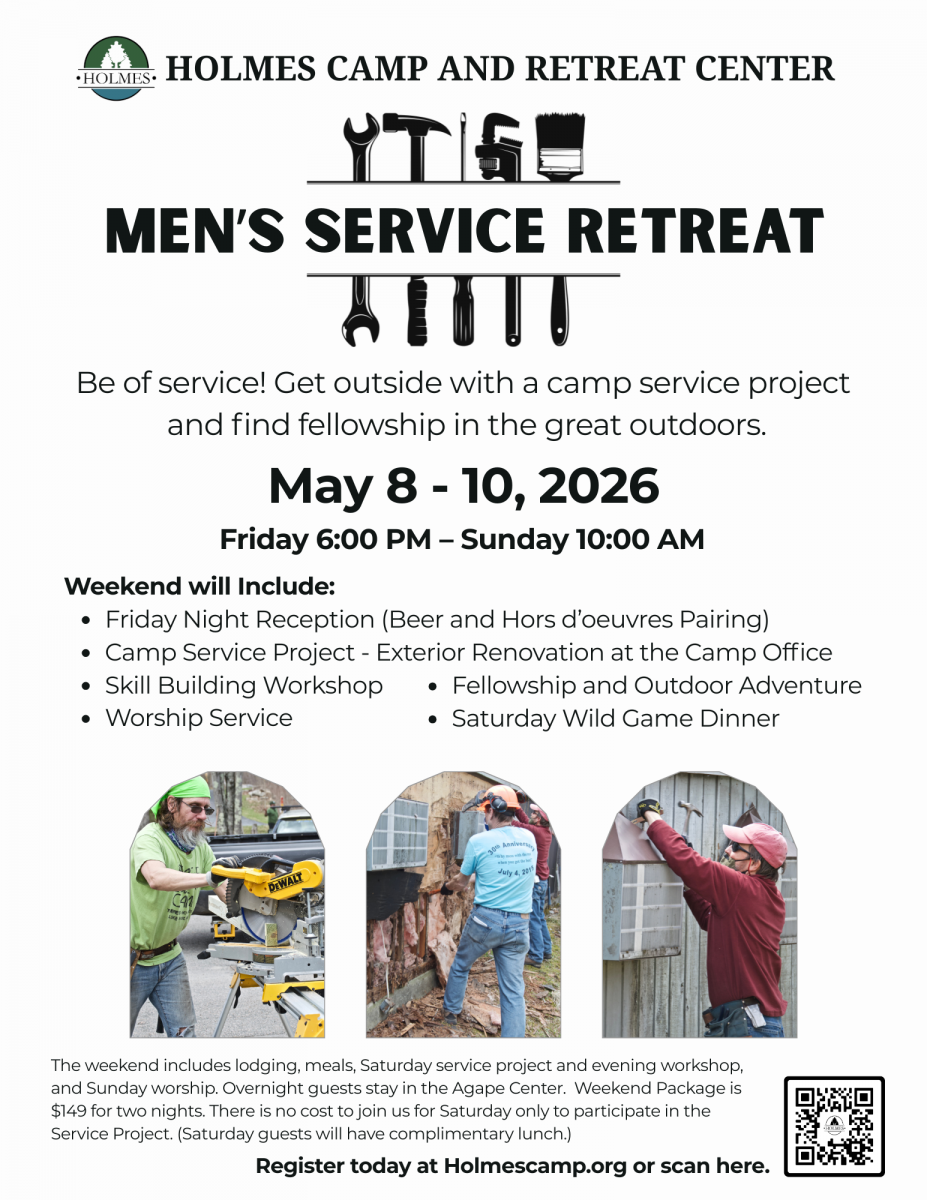 The weekend includes lodging, meals (including a Friday night beer and hors d’oeuvres reception), Saturday service project and wild game dinner, and Sunday worship. Guests will stay in the Agape Center. Each comfortable room has linens and private bathrooms.